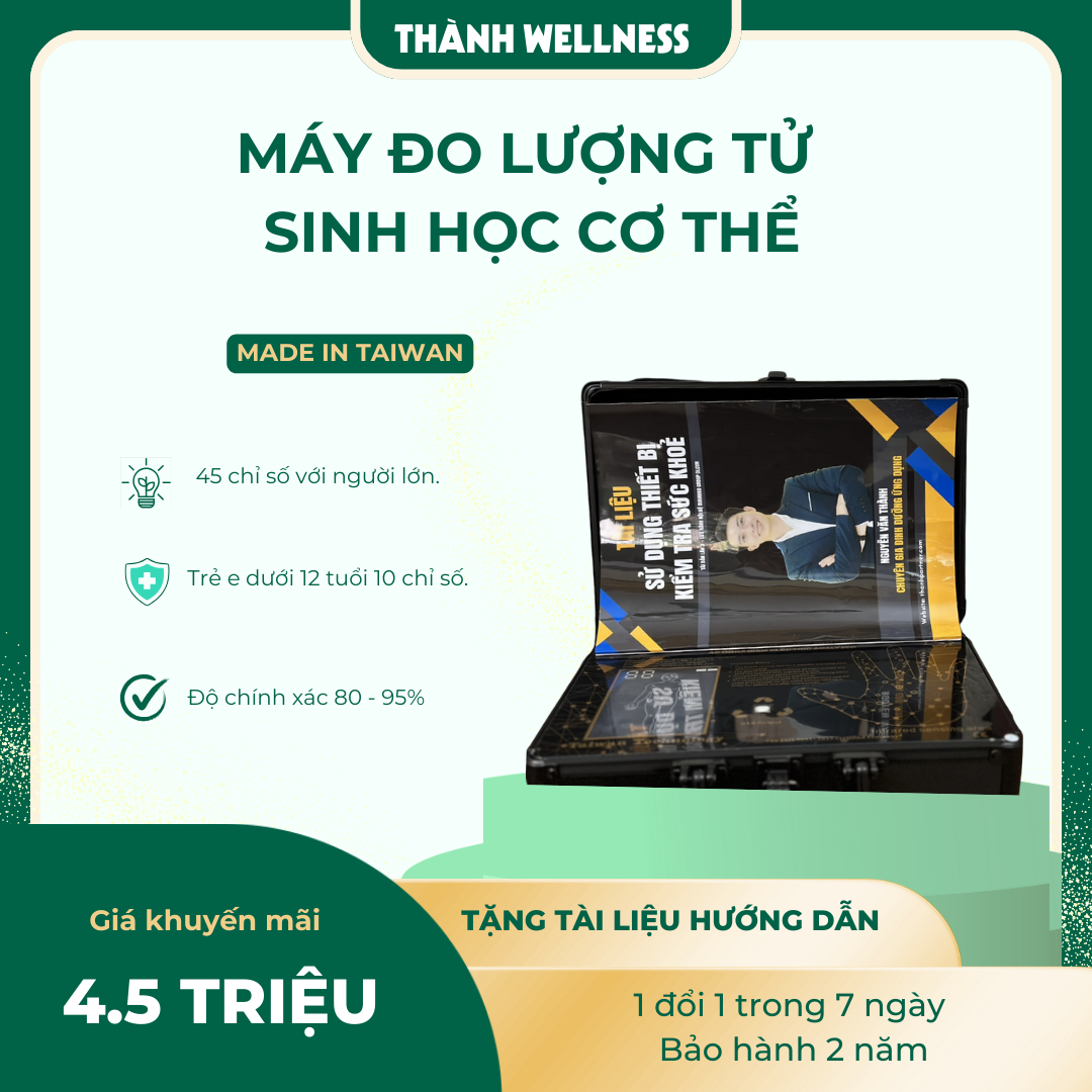 Máy đo lượng tử sinh học Đài Loan phân tích 45 chỉ số toàn cơ thể, độ chính xác 80–95%, bảo hành 2 năm, đổi mới 7 ngày, kèm sách hướng dẫn và video sử dụng.