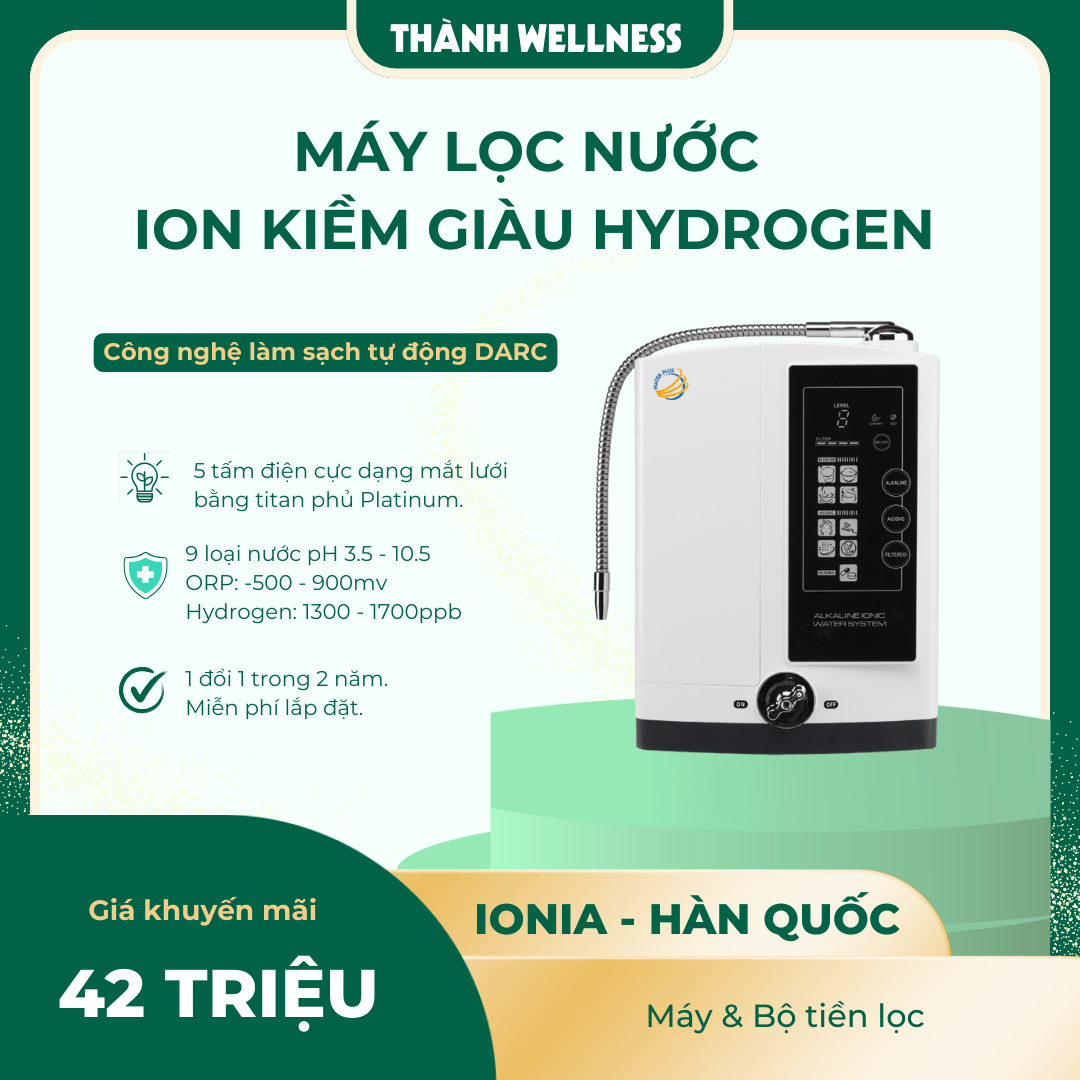 Máy lọc nước ion kiềm giàu hydrogen Water Plus ứng dụng công nghệ điện phân 5 tấm điện cực titan phủ platinum Nhật Bản và hệ lọc 6 cấp chuẩn 4000L. Sản phẩm tạo ra 9 loại nước pH 3.5–10.5, hydrogen 1300–1700 ppb, ORP -500 đến -900 mV, hỗ trợ trung hòa gốc tự do, bảo vệ tế bào, tăng đề kháng, cải thiện tiêu hóa và phòng bệnh mạn tính. Nhập khẩu IONIA Hàn Quốc, bảo hành kim cương 1 đổi 1 trong 2 năm – bảo trì trọn đời.